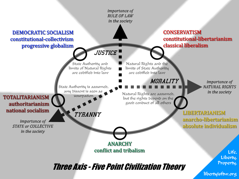 As far as Liberty is For the Win, the political spectrum is less a line than a cycle of political positions where political identities will circle around from totalitarianism to individualism and back again, often in the course of a single lifetime. Individuals each have their own internal compasses that spin in whatever direction their personal beliefs may lead them, often in naive attachment to political ideologies utterly contrary to their espoused orthodoxy. This happens when the orthodoxy is unclear, so let’s make clear what we have been given as of first importance, so we can speak clearly about conservative “doctrine”, as opposed to the mystery soup that is slopped around colloquially today.